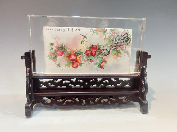 この屏風の最大の魅力は、ガラス板の内側に精巧に描かれた花鳥図です。艶やかな赤い果実をつけた枝と、その周りを舞う小鳥たちが色鮮やかに表現され、まるで豊穣の秋を封じ込めたような美しさです。熟練の内画師が特殊な技法を用いて制作し、果実の瑞々しさや鳥の羽毛の質感まで繊細に描写されています。画面上部には漢詩も書かれており、文人の風雅な世界観を感じさせます。