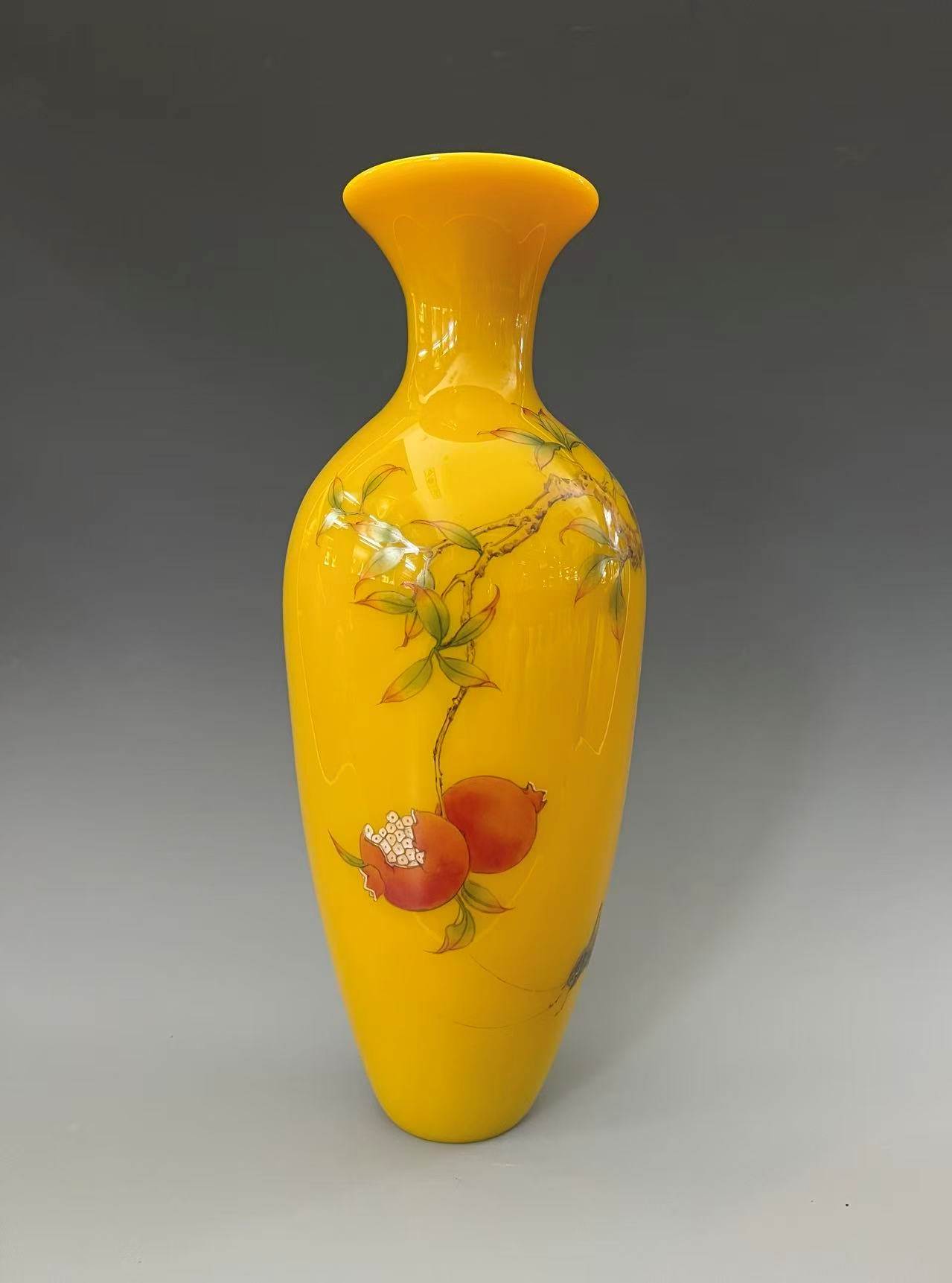 鶏油黄の深い黄色と、色鮮やかな石榴の絵が美しいコントラストを生み出し、見る角度により異なる表情を楽しむことができます。花瓶として実用的に使用することも、純粋に鑑賞用の芸術品として飾ることもできる、中国古典陶磁器の自然美と芸術性を表現した逸品です。