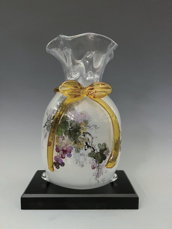 透明クリスタルガラス製の縁起物「福袋」です。袋の形を模した独特なデザインで、金色のリボン装飾が福を包む袋の口を表現しています。内面には内画技法により葡萄の絵が精密に描かれ、紫の果実と緑の葉が豊穣と繁栄の願いを込めています。