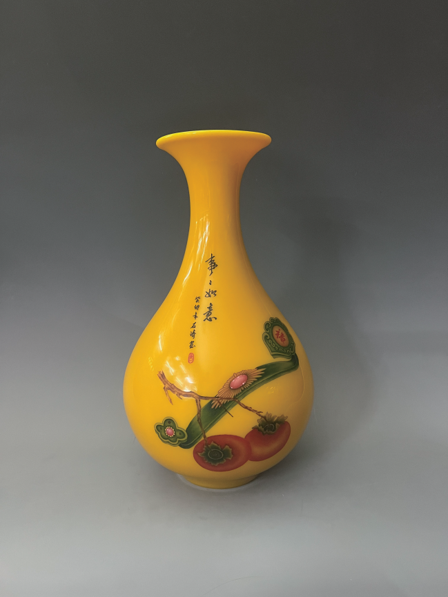 この優雅な「鶏油黄外刻瓶」は、清朝皇室で珍重された鶏油黄釉の温かく深みのある美しい黄色を基調とした陶磁器作品です。瓶の形状は口部が大きく広がり、胴部が洋梨のように膨らんだ独特のフォルムを持ち、中国古典陶磁器の優美な造形美を体現しています。外刻技法により表面に直接描かれた絵柄は、精密な筆致と鮮やかな色彩で表現されており、職人の高度な技術力が感じられます。
