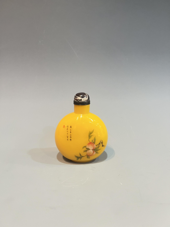 高さ12cm、幅9cmの「鶏油黄外絵煙壺」です。清朝皇室で愛用された高貴な鶏油黄の陶磁器地に、外画技法によりピンクの花と緑の葉が繊細に描かれています。漢字による詩句が文人の雅趣を添え、精巧な金属蓋が機能性を兼ね備えています。