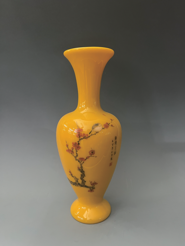 鶏油黄の深い黄色と、外画による自然な梅の絵が美しいコントラストを生み出し、見る角度により異なる表情を楽しむことができます。花瓶として実用的に使用することも、純粋に鑑賞用の芸術品として飾ることもできる、中国古典陶磁器の優美さを代表する逸品です。