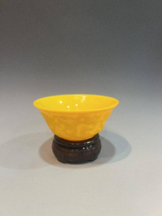 高さ20cmの縁起物「鶏油黄碗(聚宝盆)」です。清朝皇室で珍重された鶏油黄釉の深みのある美しい黄色が特徴で、聚宝盆の名の通り富と幸運を呼び込む縁起物として親しまれています。口部が大きく広がる優雅な曲線フォルムは、まさに宝物を受け止めるにふさわしい美しさです。
